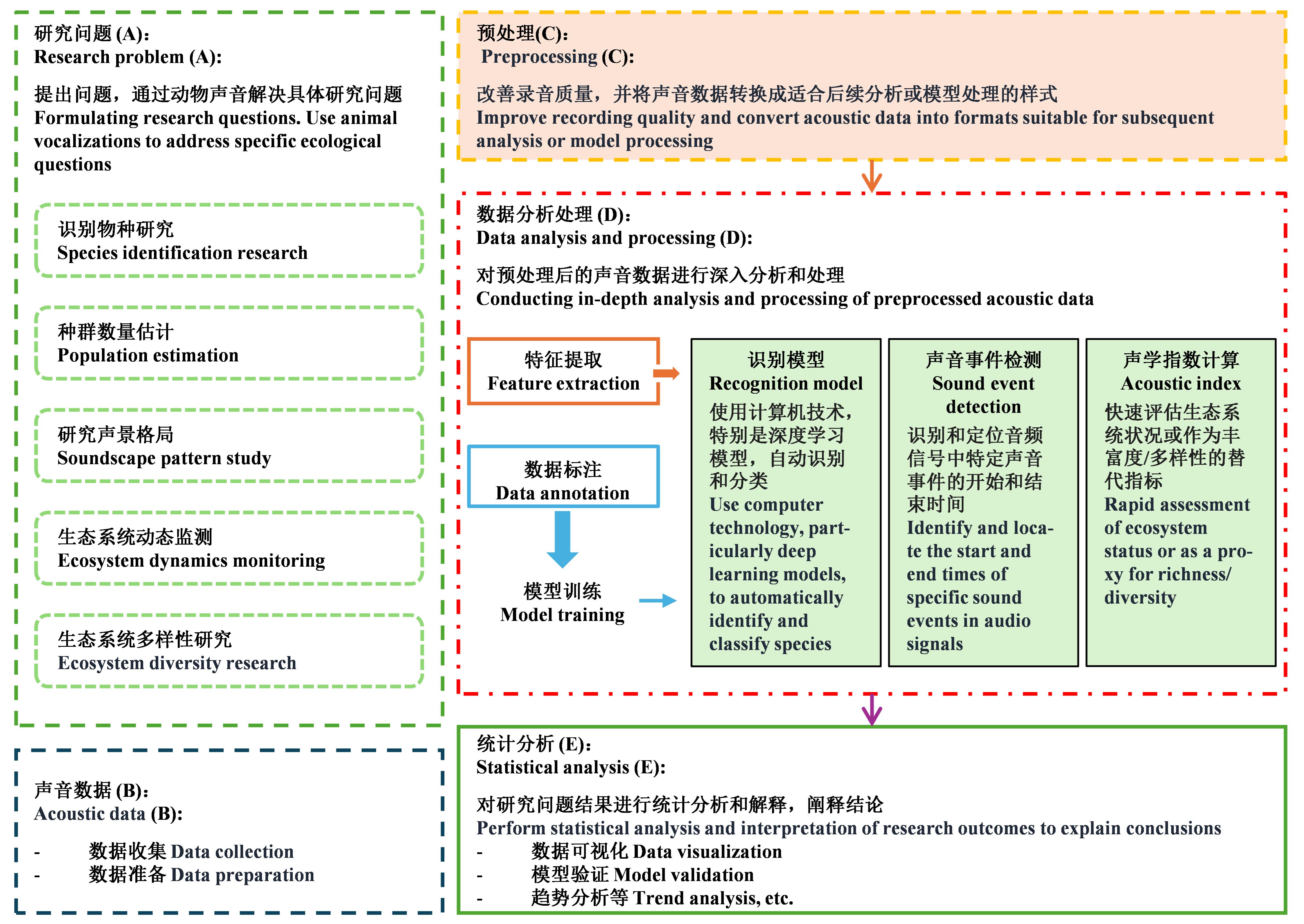 陆生哺乳动物声音数据处理分析软件是专用于辅助生态学研究者自动化、高效处理和分析生物声学录音的有效工具,是挖掘动物声音深度信息的重要对象,为生态和动物声音分析提供基础工具支持。随着被动声学监测技术和人工智能的快速发展,动物声音分析处理软件的数量和种类显著增加,在声音降噪、声学指数、数据标注、动物识别和特征提取等方面实现较大的进展。本文系统检索相关文献和开源软件平台,阐述了陆生哺乳动物声音数据处理分析的流程,讨论了陆生哺乳动物声音分析软件的现状及其在生态声学研究中的应用,并对动物声学的国产化和人工智能辅助软件的开发与未来研究进行了展望。