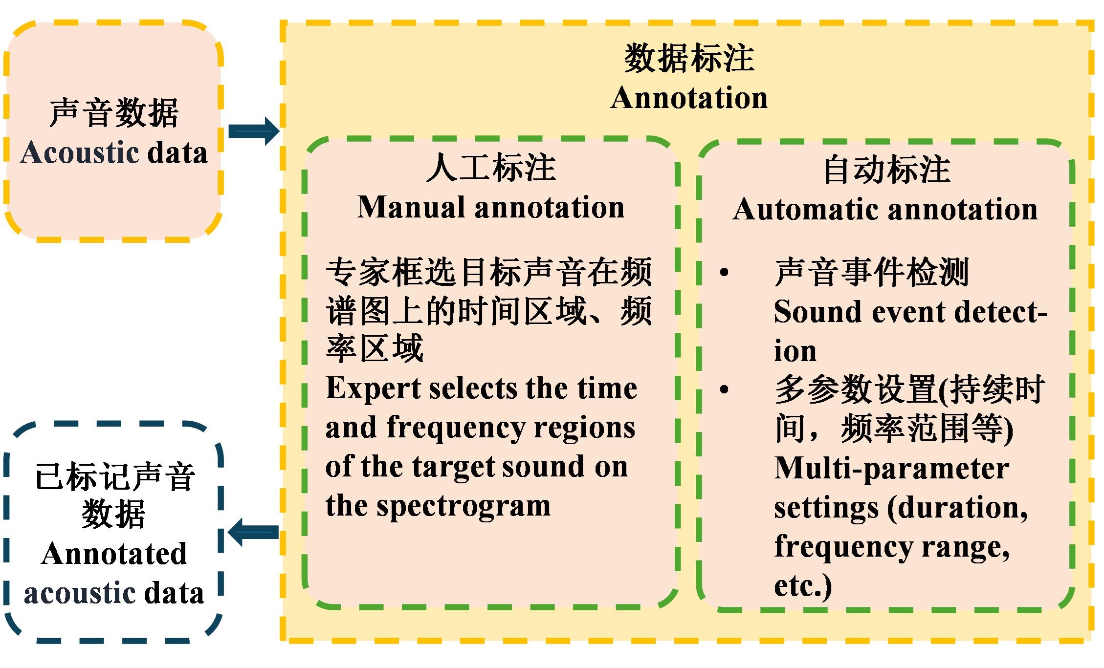 图 4 基于深度学习的动物声音识别典型工作流程. 图示左边对应于大部分识别任务流程,而参与模型构建的开发者则贯穿整个过程