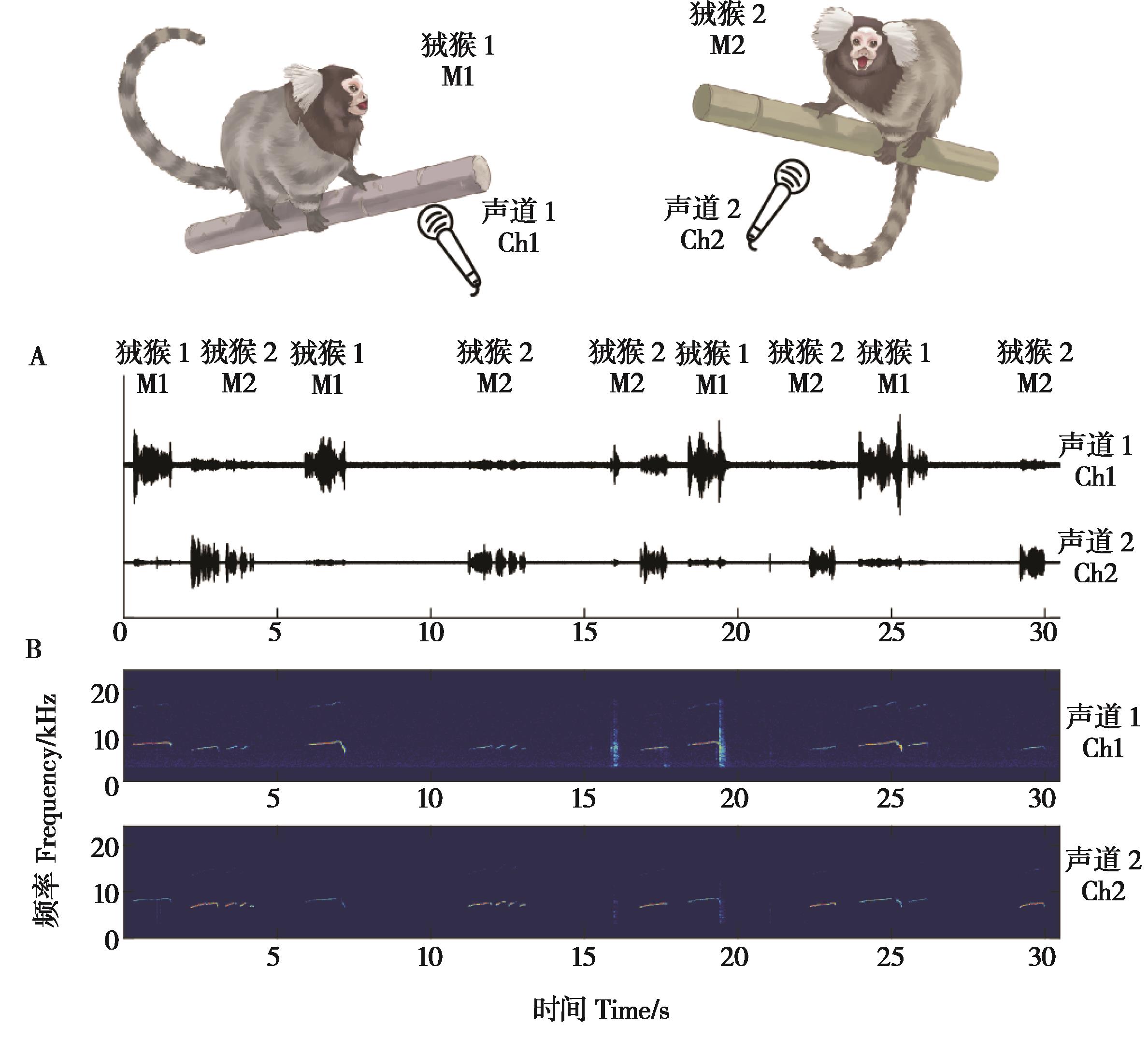 图2 普通狨的轮流发声现象. A:采用双通道独立麦克风系统对两只普通狨 (M1与M2) 同时进行声音信号采集所获取的时域信号.声道1 (Ch1) 指向M1,声道2 (Ch2) 指向M2. 通过比较两个声道所采集叫声的相对幅度,对发声个体进行判别与标识,结果如图A上部所示. B:图A所对应信号的声谱图