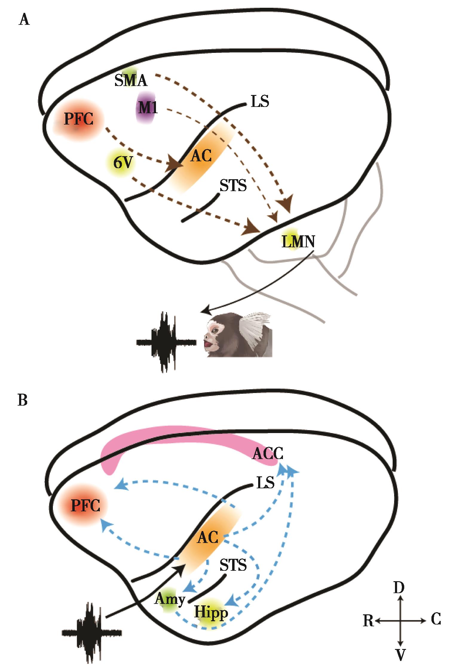 图3 普通狨发声控制和叫声编码的主要脑区和神经环路. A:普通狨发声的皮层网络. M1、SMA 和6V到喉运动神经元的控制,其中SMA和6V连接更强 (用较粗的线条表示). 前额叶皮层在个体自主发声前发出信号到听皮层形成反馈性抑制. B:普通狨参与叫声感知的神经环路. 从听觉皮层的喙侧投射到腹外侧前额叶,代表腹侧通路,而尾侧投射到背外侧前额叶,代表背侧通路. 前扣带回皮层、杏仁核、海马均呈现出对同类叫声选择性反应,其中前扣带回皮层逆行示踪至杏仁核和高级听觉皮层. AC:听皮层;ACC:前扣带回皮层;PFC:前额叶皮层;Amy:杏仁核;Hipp:海马;LS:外侧沟;STS:颞上沟;M1:初级运动皮层;SMA:辅助运动区;6V:布罗德曼6区腹侧部;LMN:喉运动神经元. 方向轴,D:背侧;V:腹侧;C:尾侧;R:喙侧
