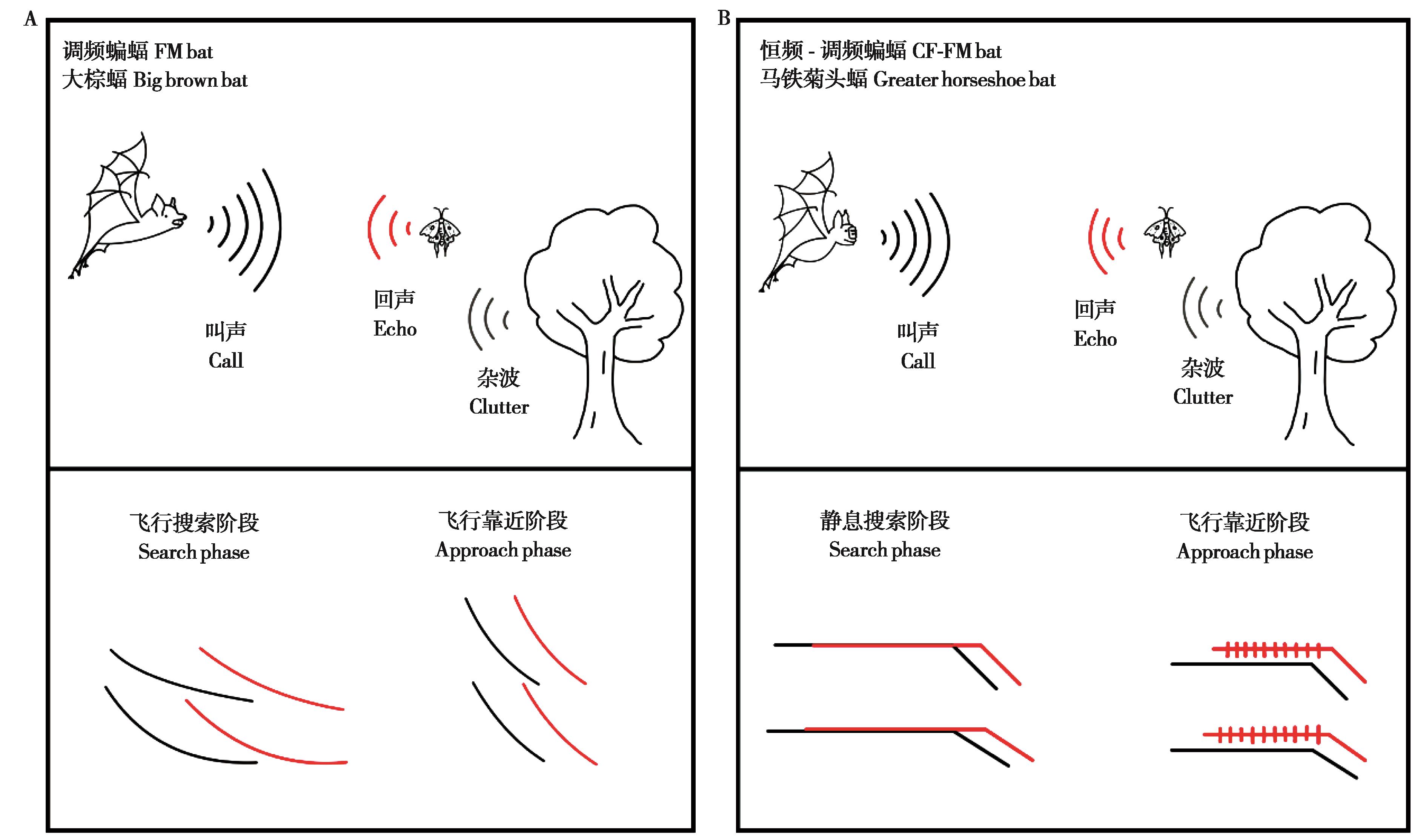 图1 蝙蝠捕食过程中回声定位声波示意图. 上图:典型调频蝙蝠——大棕蝠 (A) 和典型恒频-调频蝙蝠——马铁菊头蝠 (B) 在捕食声境下的回声定位示意图,及植被反射的杂波;下图:叫声和回声声谱示意图,包括搜索阶段和靠近阶段
