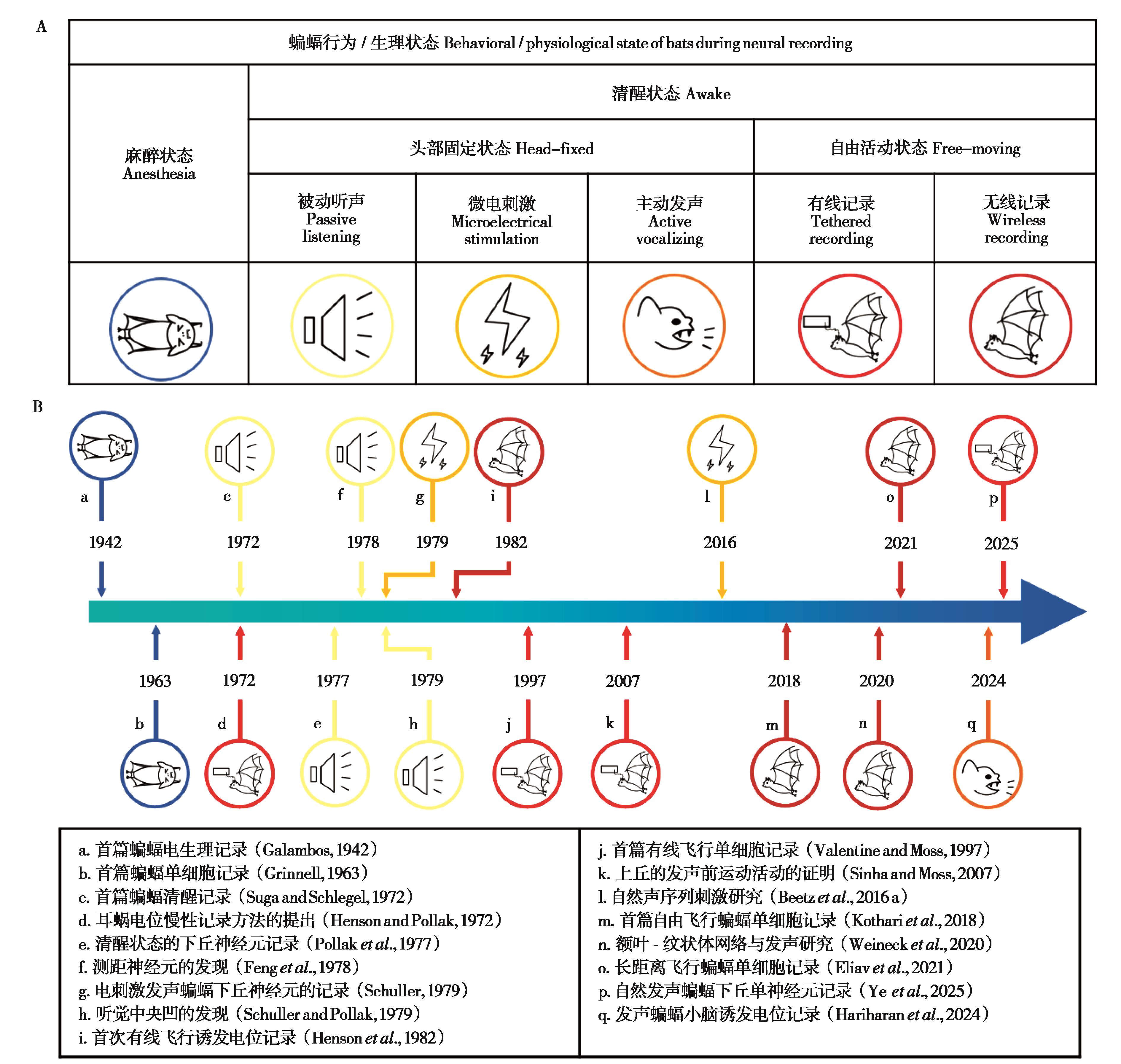 Fig. 2 Representative findings of the auditory mechanisms for bat echolocation revealed by different electrophysiological recording methods. A: Schematic diagram of behavioral paradigms of auditory electrophysiological recording in bat echolocation; B: Timeline of some studies and summary of key findings for auditory electrophysiological recording in bat echolocation